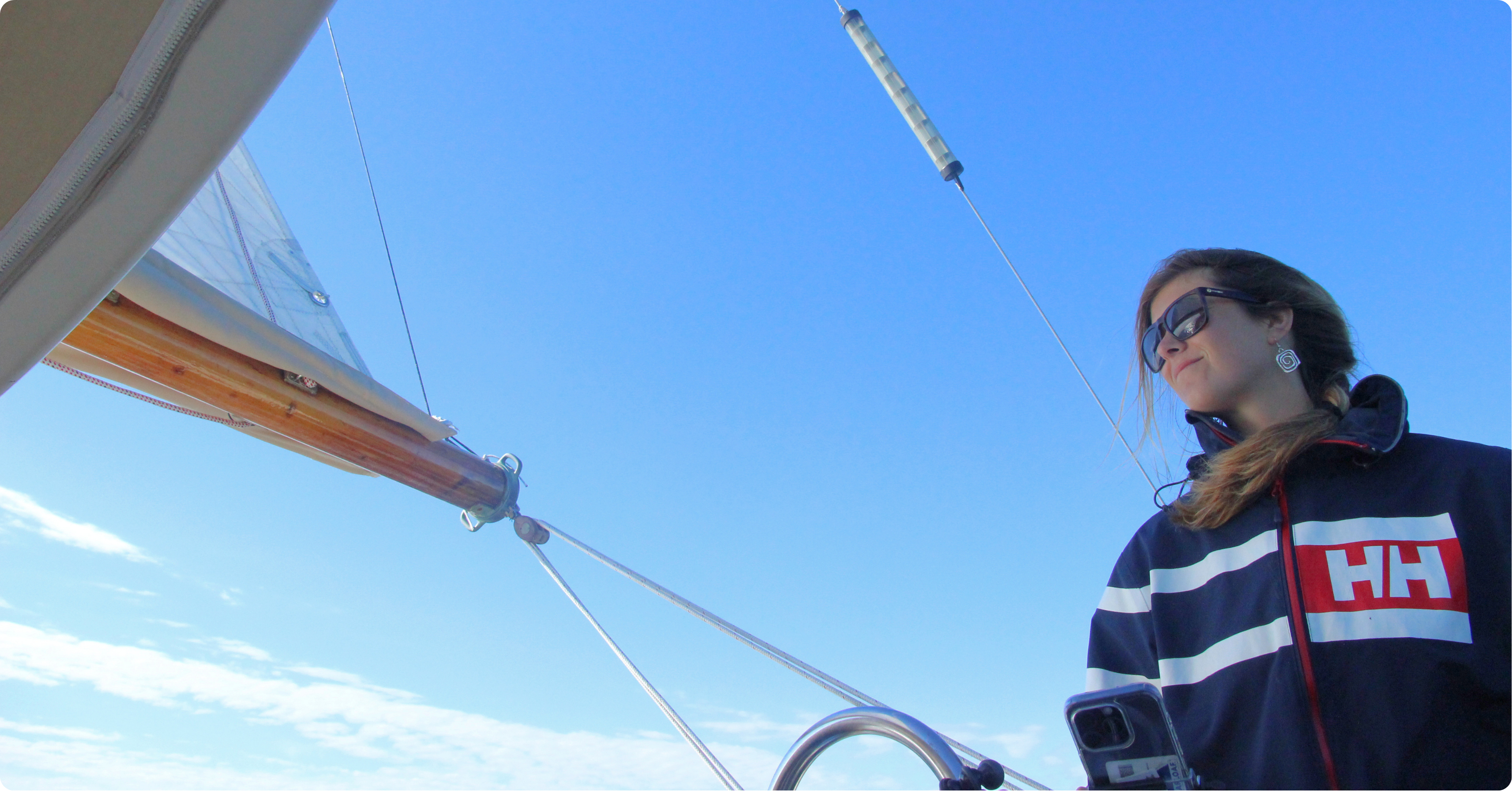 Lauren at the helm on a Downeast cruise aboard Maui